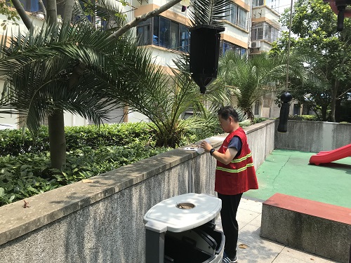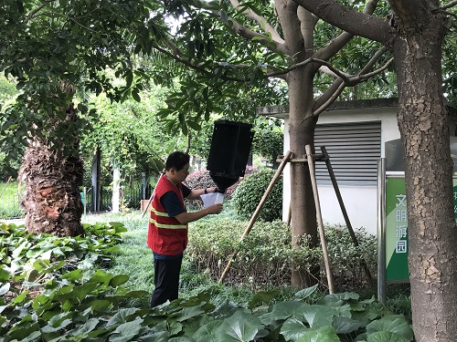 幾個月前在綠地中發(fā)現多株加納利海棗枯萎死亡,園林公司綠化養護部立刻采取措施,通過(guò)幾個月的監測查出原因,是因紅棕象甲的爲害而導緻死亡。紅棕象甲蟲害很難防治,因此在奉賢區綠化所的技術支持下,五月中旬分别于正陽中央公園、環東環南綠地、中醫院北側綠地、電影院東側綠地放置了紅棕象甲誘捕器共7個。