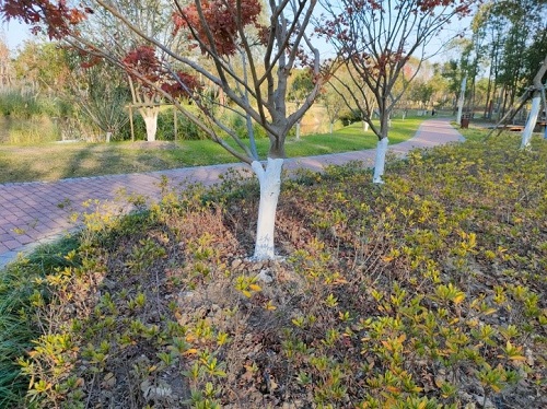 進(jìn)入冬季,園林公司對(duì)綠地内的落葉層逐步進(jìn)行清理,給重點樹木根部進(jìn)行塗白,加點殺菌殺蟲卵的藥劑,主要起(qǐ)到防病防蟲爲主,防寒防凍爲輔的作用。特别是容易發(fā)生病蟲害的一些花灌木,如紅葉李、紫薇、梅花、櫻花、紅楓等,通過(guò)冬季的防護,可以減少來年的病蟲害的發(fā)生量。